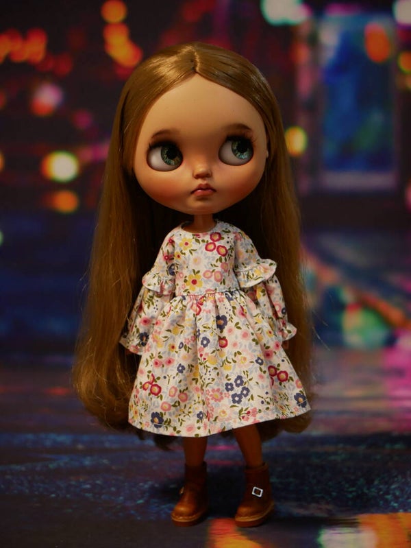 Beautiful cotton dress for Blythe dolls / White with flowers print Fabric.