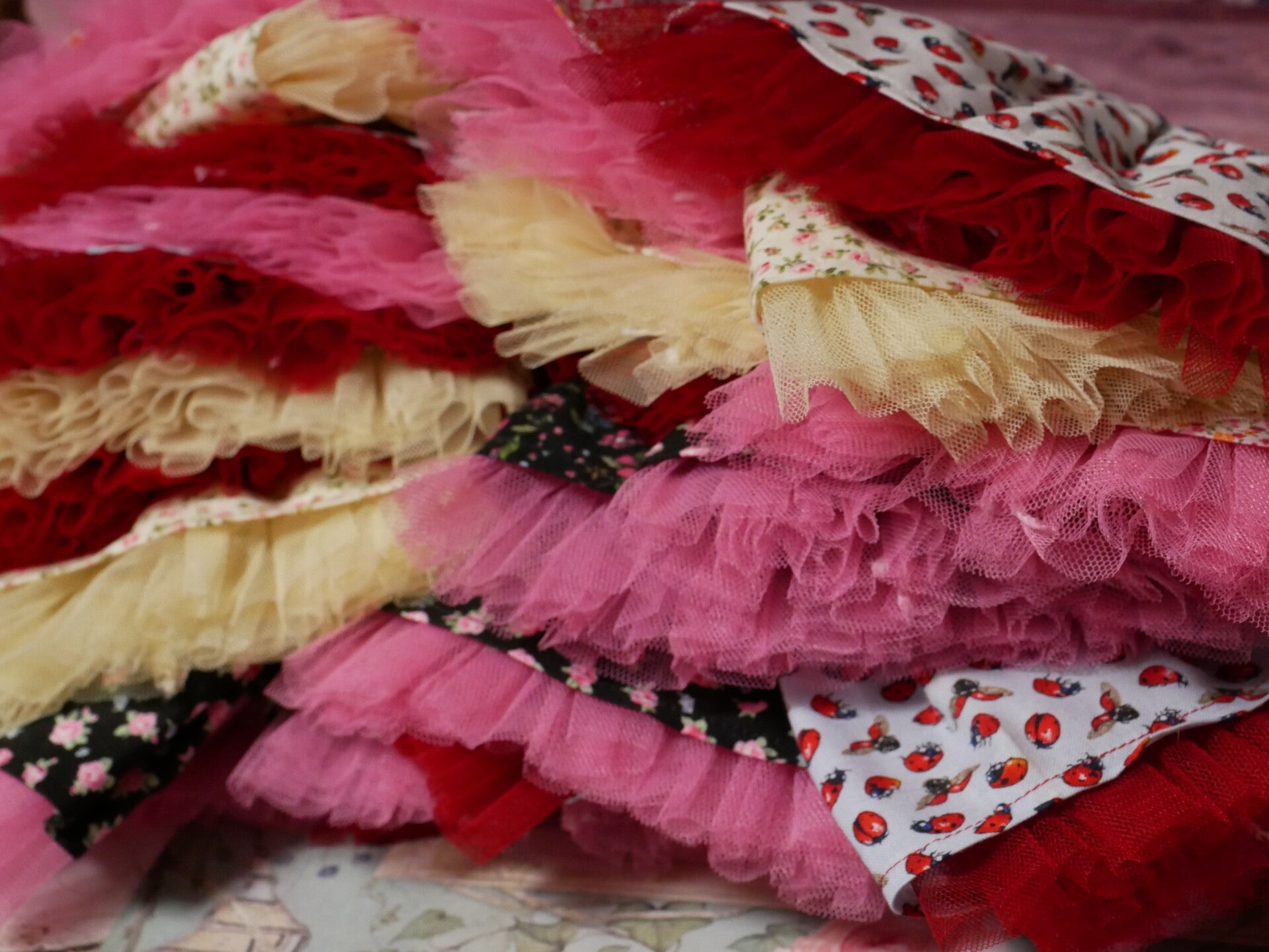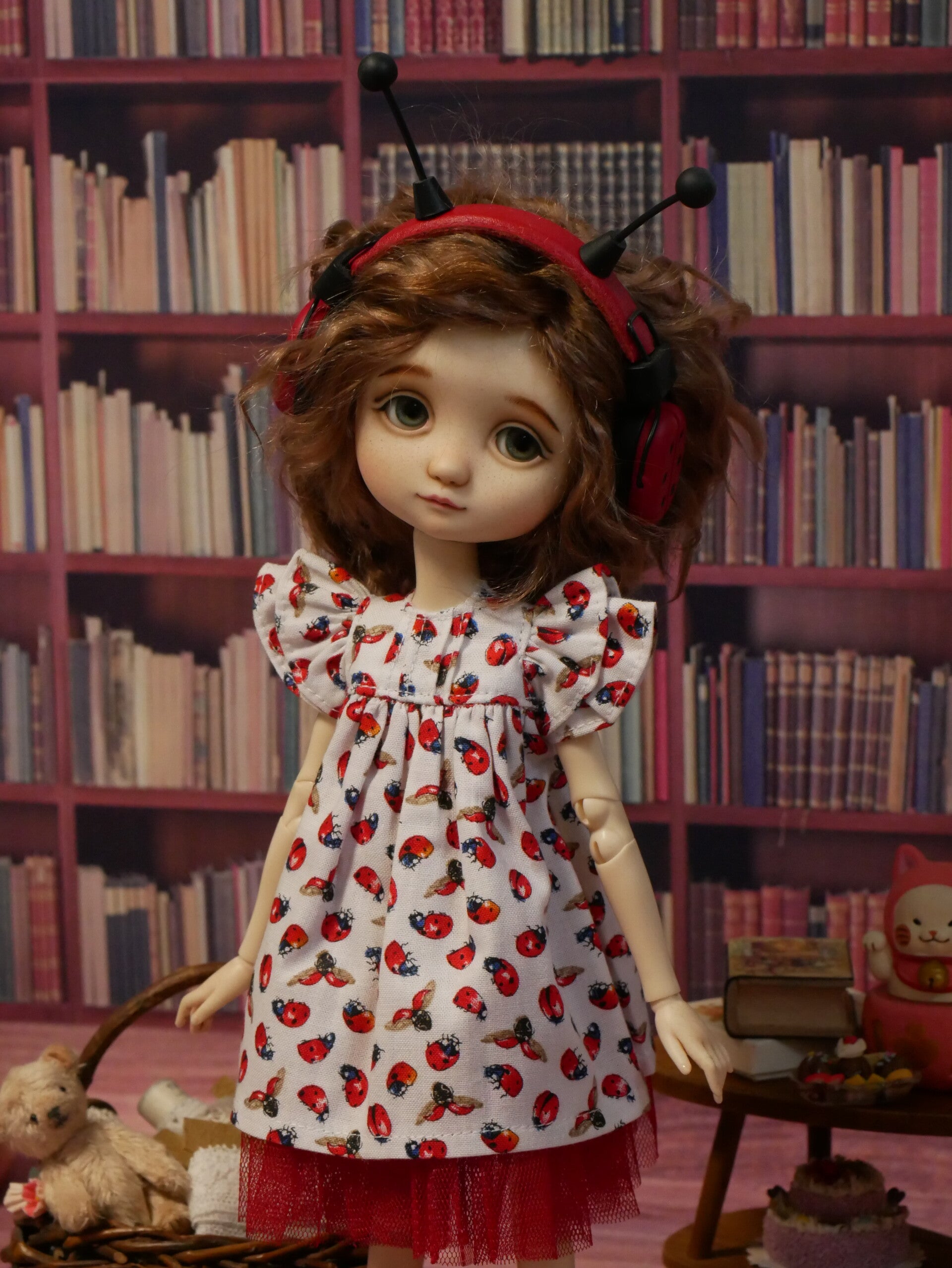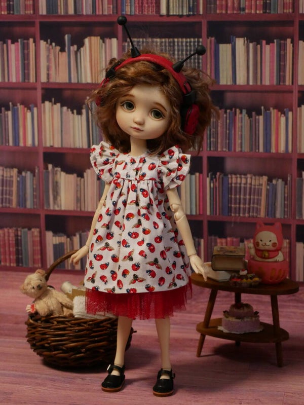 Ladybug print ruffle sleeves dress with tulle petticoat in one piece for Blythe or Emily dolls.