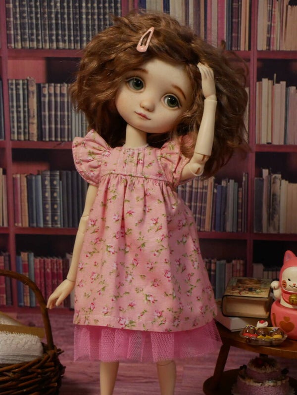 Floral print ruffle sleeves dress with tulle petticoat in one piece for Blythe or Emily dolls.