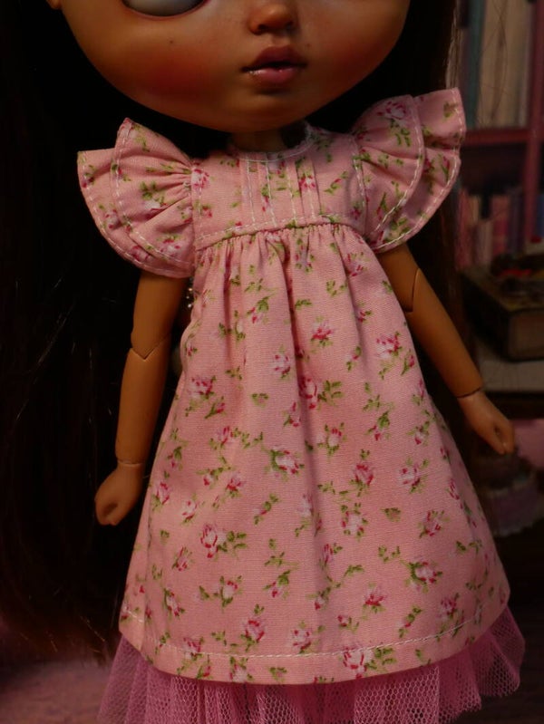 Floral print dress with tulle petticoat for Blythe or Emily dolls/ Pink