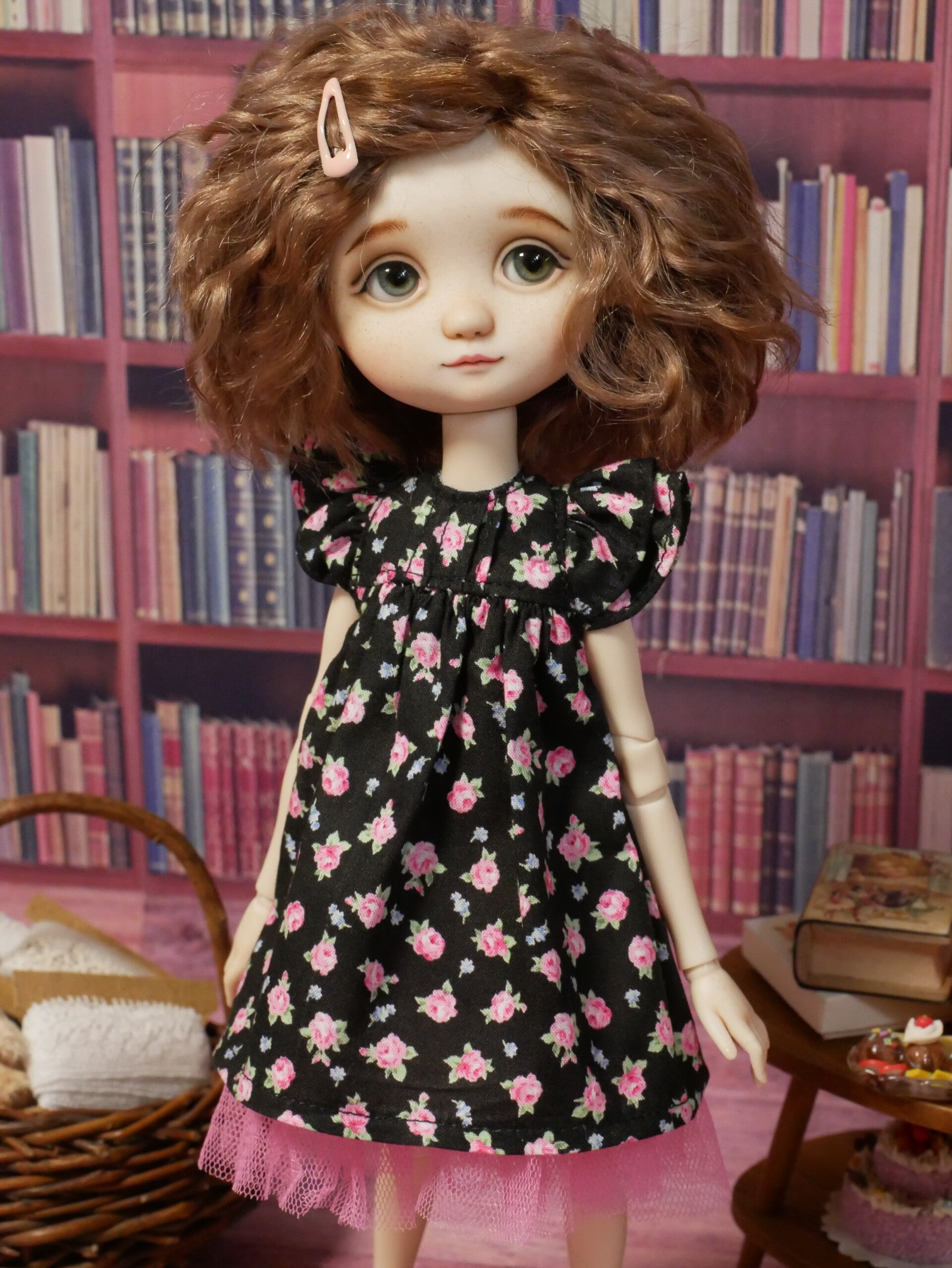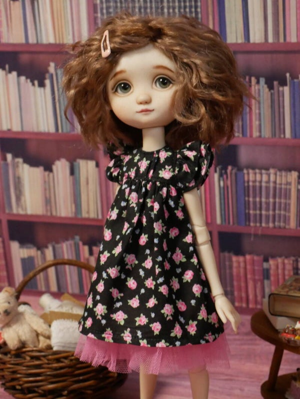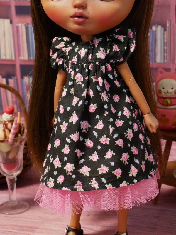 Floral print dress with tulle petticoat for Blythe or Emily dolls/ Black