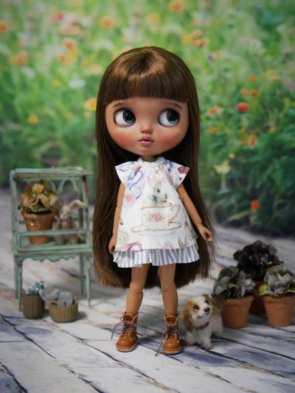 Cute rabbit print dress for Blythe & Qbaby dolls/ Gray 03