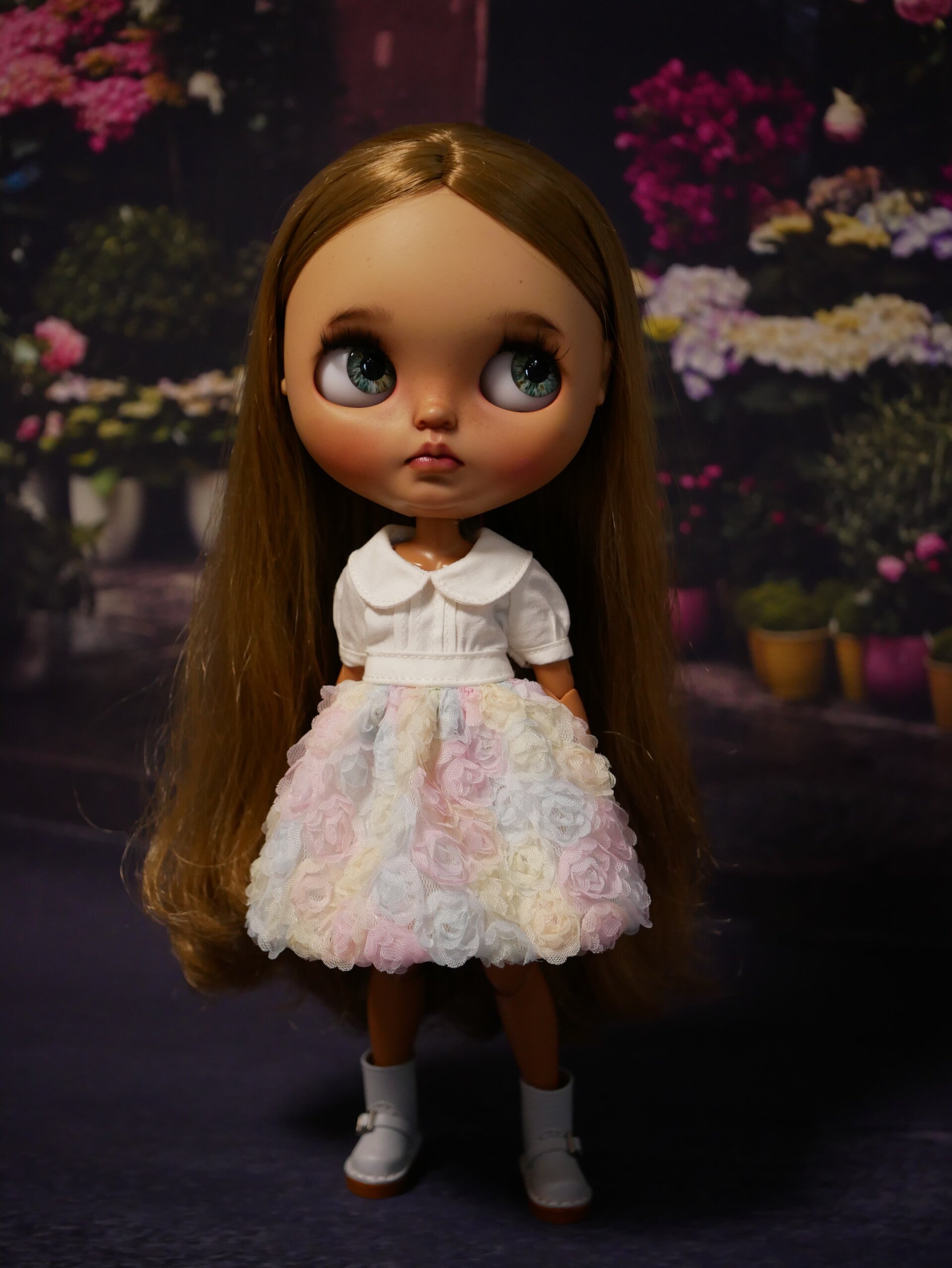 Embroidered 3D rose dress for Blythe dolls./ White/mix pink