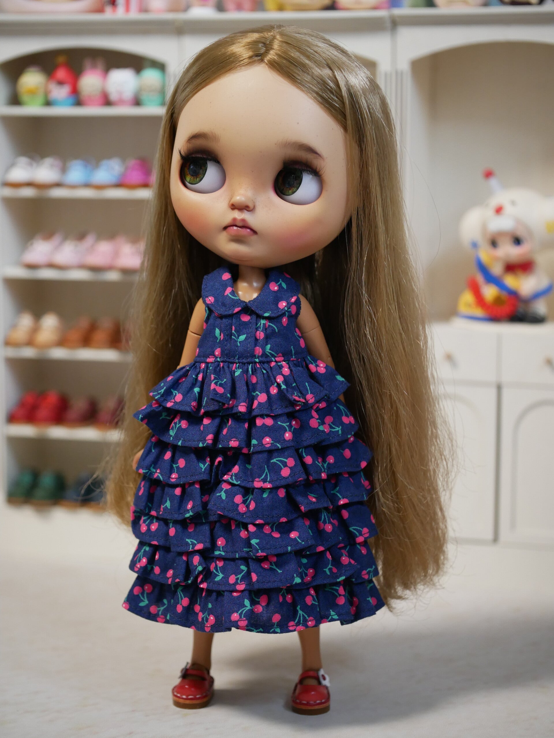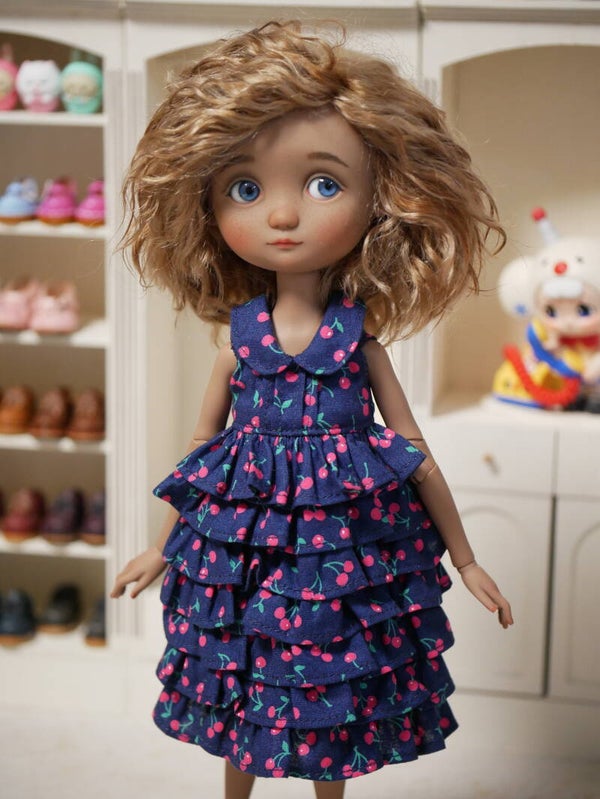 Beautiful cherry dress, with ruffle for Blythe and Emily doll./ Dk blue