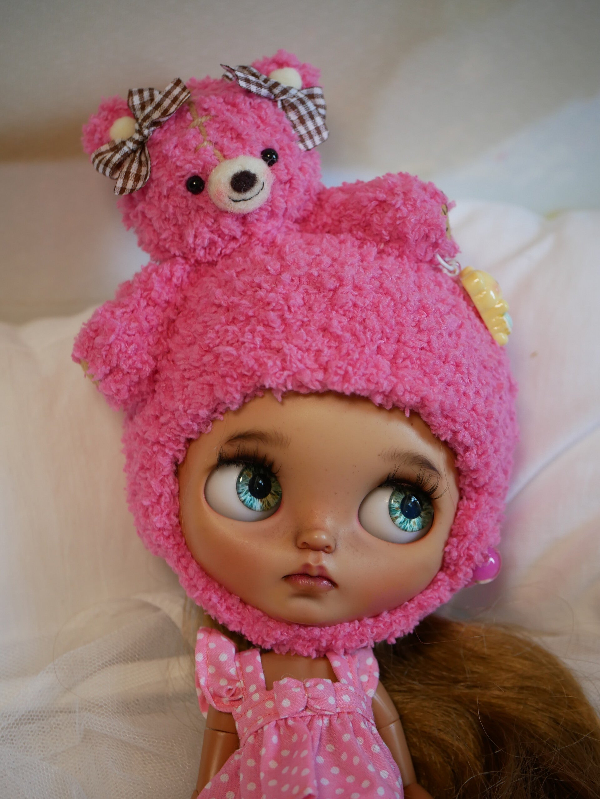 Blythe crochet Bears Hat./ Hot Pink Bear/ black