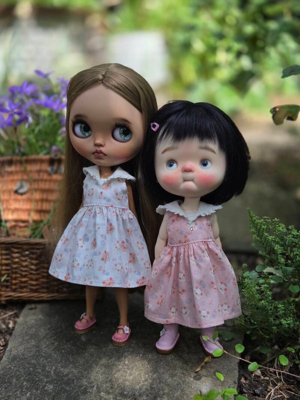 Sleeveless dress for Blythe & qbaby dolls with cute pig print. / Lt blue