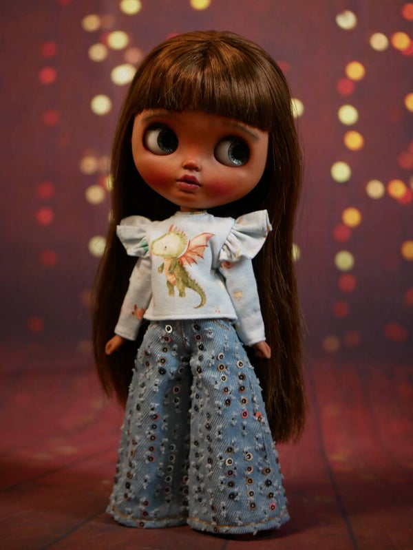 Wide denim pants with sequins for Blythe doll./ Lt blue