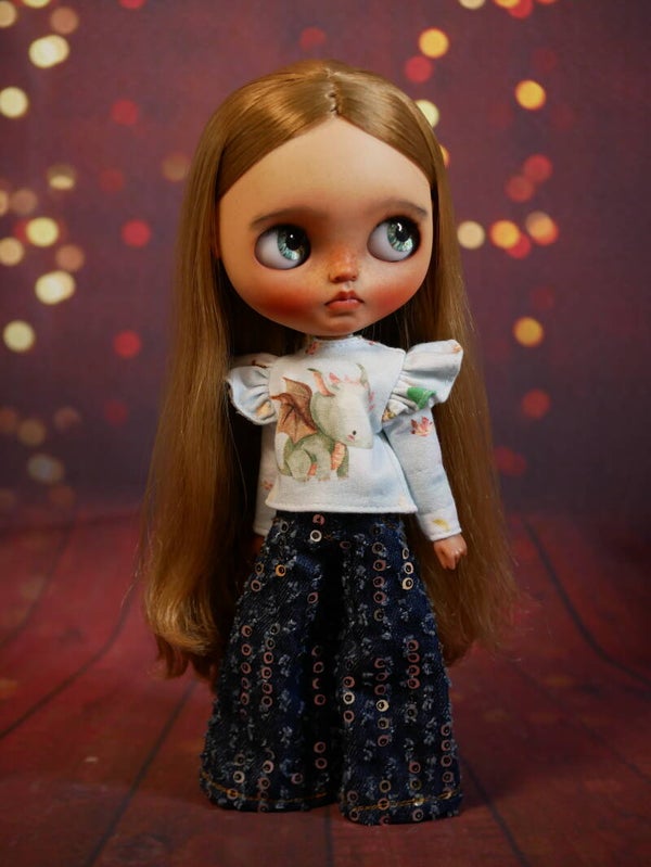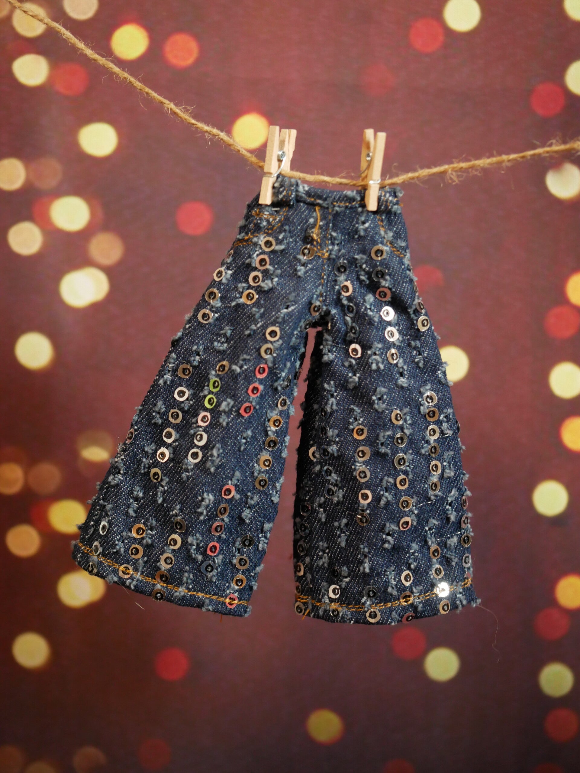 Wide denim pants with sequins for Blythe doll./Dk blue